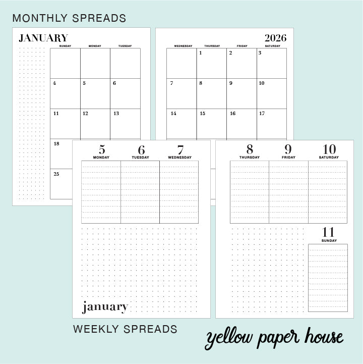 - Each month section consists of the Monthly layout, followed by the Weekly layouts for that month