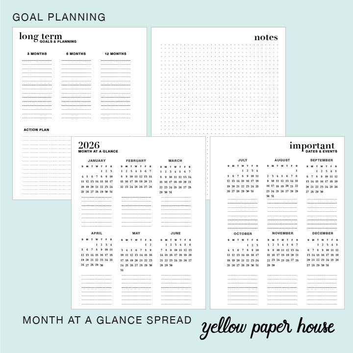• The Opening section includes full JANUARY - DECEMBER 2026 Calendar At A Glance with space to make notes, and Goal-Setting section