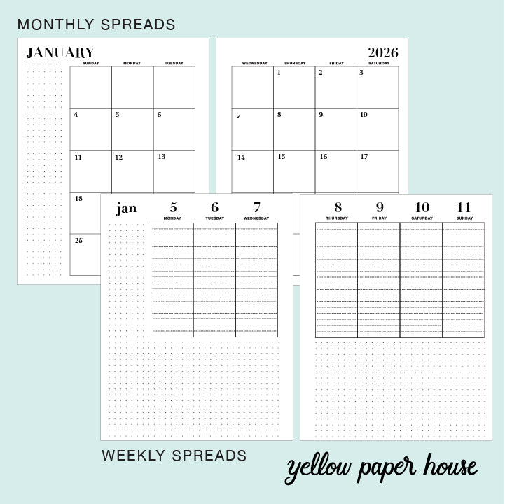 • Each month section consists of the Monthly layout, followed by the Weekly layouts for that month