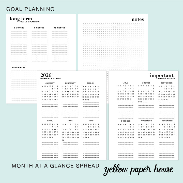 - The Opening section includes full JANUARY - DECEMBER 2026 Calendar At A Glance with space to make notes, and Goal-Setting section