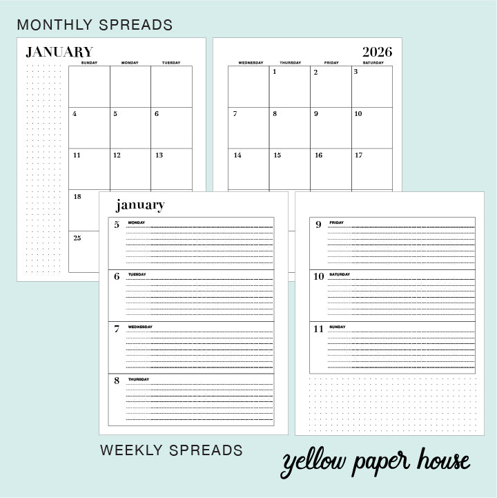 - Each month section consists of the Monthly layout, followed by the Weekly layouts for that month